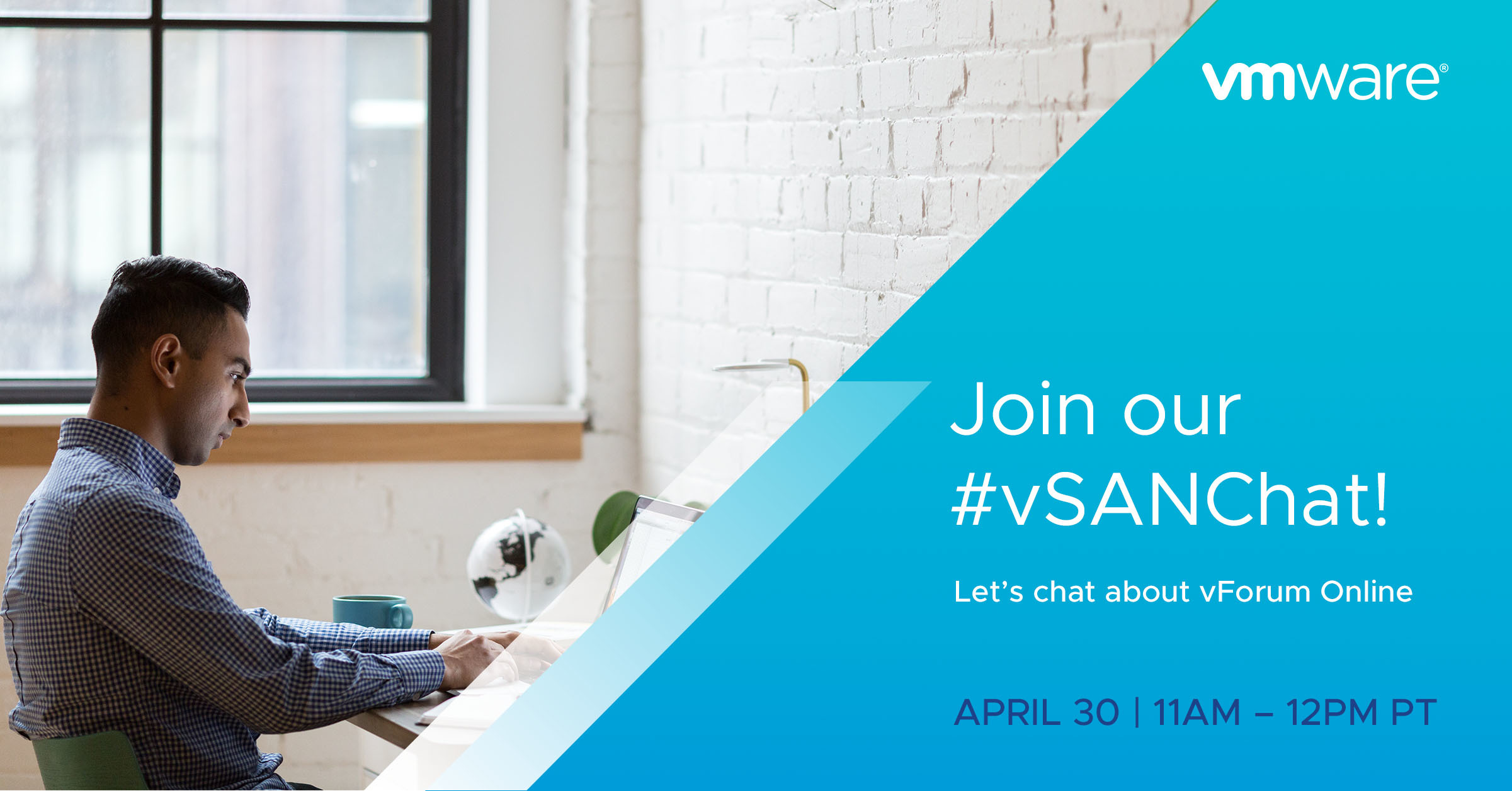 The vSAN and vSphere Twitter channels are teaming up for a Twitter chat on 4/30 to talk about vForum Online. Join vExperts, VMUG members, and session hosts to discuss all the exciting vSAN and vSphere content.